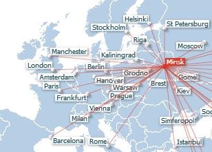 Most travellers to Minsk arrive by plane. The National Airport in Minsk is the major one for Belarus. The national airline Belavia operates daily flights between many major European cities. Other airlines that fly into Minsk: Lufthansa, Austrian Airlines, Lot, El Al, Etihad Airways, S7 Airlines and budget Air Baltic. (See Minsk Airport website). The Minsk airport is located some 50 km from Minsk. To get to the city from the airport you can take a bus (~€ 2), take a taxi (~€ 30) or rent a car. Buses depart every hour from 7 am to 10.30 pm. Buses arrive in Minsk to the Central Bus Terminal (which is next to the Central Rail Terminal). Taxis are available at the airport every time there are arrivals. A car rental office is at the arrivals terminal.